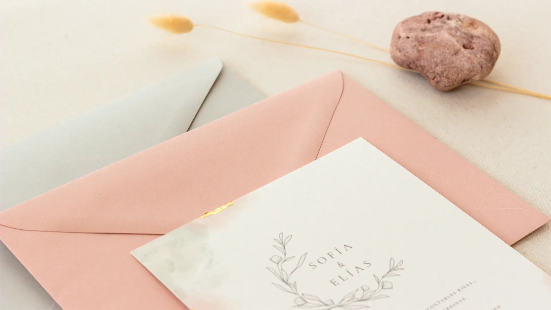 La colección Raíces se inspira en la fuerza de las piedras y la conexión con la tierra. Invitaciones de boda minimalistas y modernas, con detalles en pan de oro, que transmiten elegancia atemporal y sobriedad sofisticada.