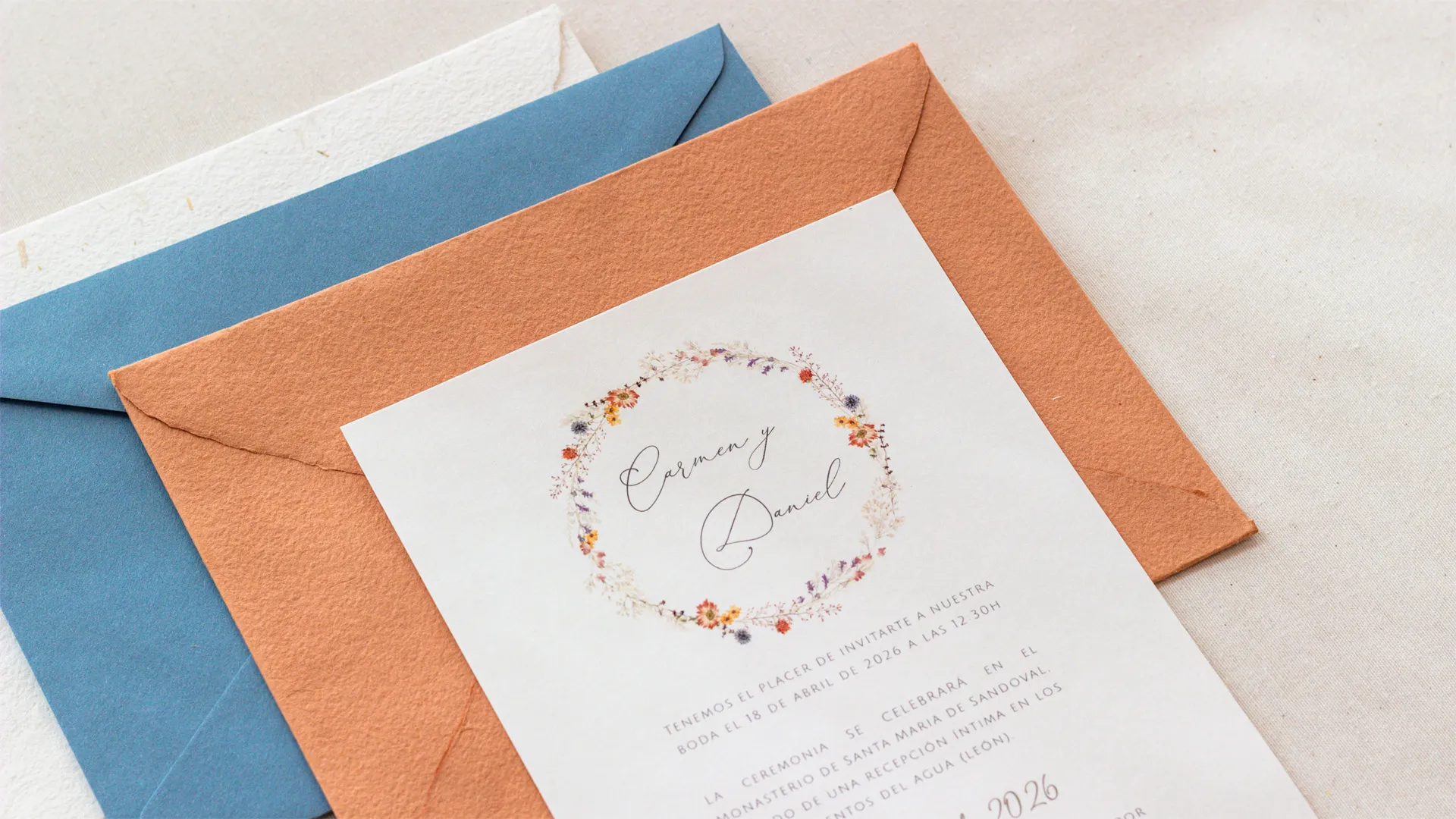 Invitaciones de boda florales con textura y alma natural