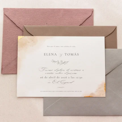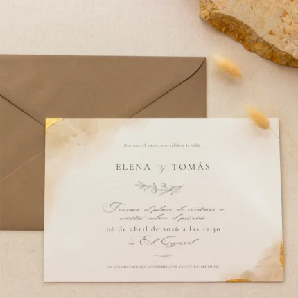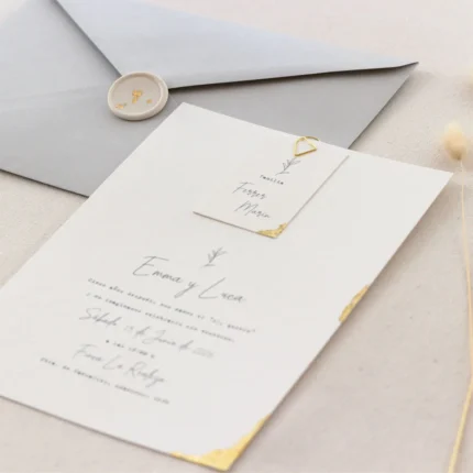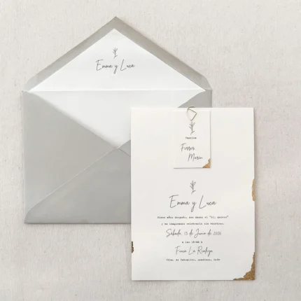 Invitación de boda Isela - La invitación Isela destaca por su diseño limpio y sereno, con papel de textura suave y delicados acentos dorados. Un estilo contemporáneo y refinado, ideal para parejas que buscan invitaciones de boda exclusivas y atemporales, perfectas para bodas modernas, urbanas o de inspiración elegante.