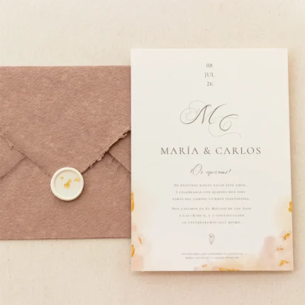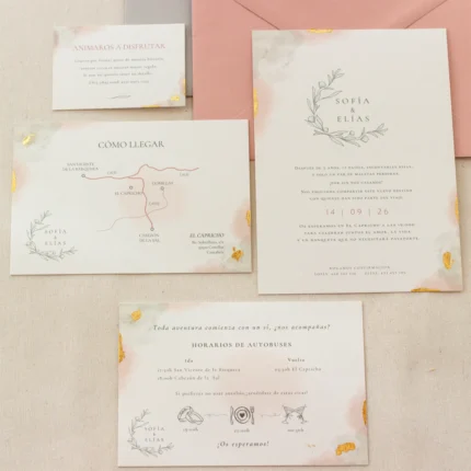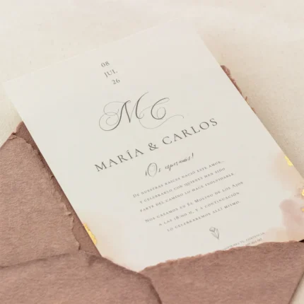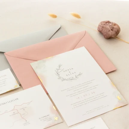Invitación de boda Rosalba - La invitación Rosalba se inspira en los reflejos rosados de los atardeceres sobre la piedra de Boñar. Con un diseño minimalista y delicados toques dorados, transmite romanticismo y sofisticación. Una propuesta ideal para parejas que buscan invitaciones de boda elegantes y únicas, perfectas para bodas al atardecer o con un estilo natural y contemporáneo.